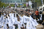 클릭평택 이석구 기자 / 삼성전자 노조가 23일 오후 2시 평택캠퍼스 앞 왕복 8차선 도로에서 성과급 상한제 폐지 등을 요구하는 대규모 집회를 열었다. 오는 집회는 40조원 이상의 성과금 요구하는 노조의 요구를 사측이 거절할 경우 다음 달 파업을 위한 사전 집회다. 집회 참가 인원은 노조 측 현장 참가 사인이 3만 9000명, 경찰 추산 4만 여명으로 집계됐으며 경찰은 질서유지 차원으로 300여명이 배치됐다. 노조는 지난 18일 파업 찬반 투표를 실시 93.1%의 찬성으로 파업권을 확보했으며 협상이 결렬될 경우 다음 달 21일부터 오는 6월 7일까지 총파업에 들어갈 계획이다. 현재 사측은 영업이익의 10% 이상을 재원으로 사용할 것을 제안한 상태고 노조 측은 영업이익 15% 성과급 지급, 성과급 상한제 폐지 등을 요구하고 있다. 투쟁사에서 최승호 위원장은 “미래 산업이 아닌 다른 길을 선택하고 있다”며 “반도체는 AI, 전자, 자동차 등 대한민국의 미래를 좌우하는 가장 중요한 산업”이라고 말문을 열었다. 이어 “초기업 노동조합, 그리고 공동투쟁본부가 파업을 감행하는 이유는 단 하나”라고 “삼성전자의 잘못된 제도를 바꾸고 대한민국 이공계의 미래를 바꾸기 위해