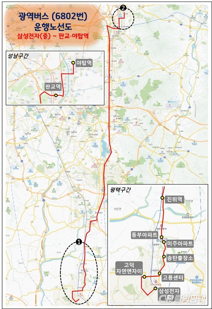 26일 시에 따르면 6802번 버스는 고덕국제신도시 내 삼성전자 정류소에서 출발해 송탄권역을 경유 후 오산나들목으로 경부고속도로를 거쳐 판교역, 야탑역 간을 운행하는 노선이다.