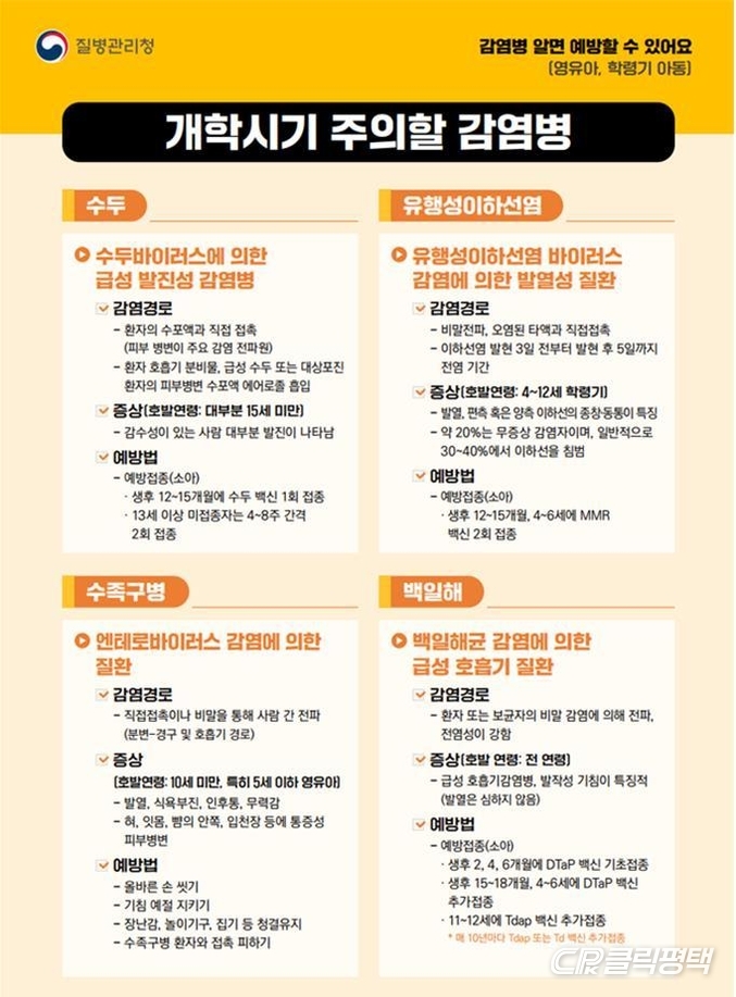 평택시(시장 정장선)는 18일 3월 새 학기를 맞아 학교생활 중 발생할 수 있는 대표적인 유행성 감염병인 수두, 유행성이하선염, 홍역, 인플루엔자에 대한 주의를 당부했다.