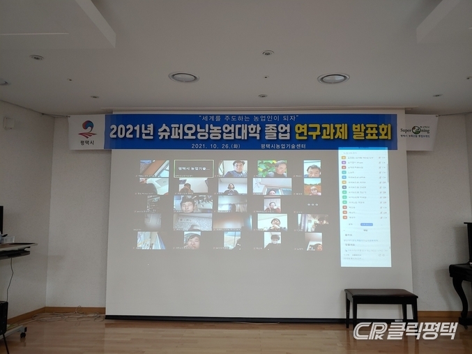 평택시는 지난 27일 농업기술센터 농촌문화체험관에서 슈퍼오닝농업대학 연구과제 발표회를 소규모 대면방식으로 개최했다.
