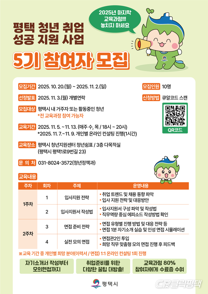 평택시(시장 정장선)는 20일부터 다음 달 2일까지 ‘평택 청년 취업 성공 지원사업 5기’ 교육생을 모집한다고 밝혔다.
