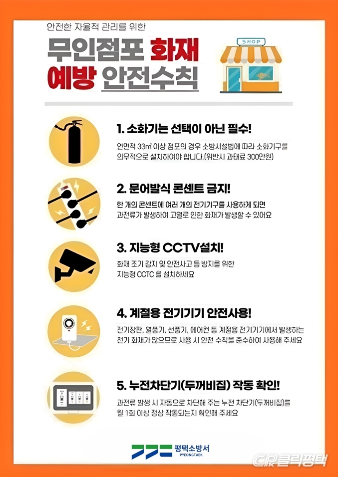 이에 따라 평택소방서는 무인점포 운영자와 이용객을 대상으로 화재예방 수칙을 집중 홍보하고 있다.