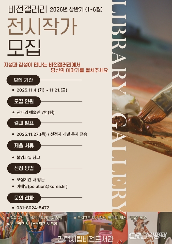평택시립 비전도서관은 다음 달 4일부터 21일까지 ‘2026년 상반기 비전갤러리’ 전시 작가를 모집한다고 밝혔다.