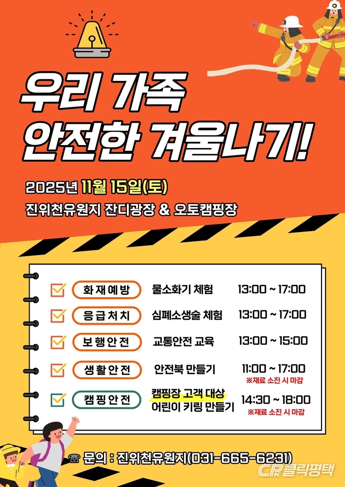주요 프로그램은 ▲화재 예방을 배우는 ‘물소화기 체험’ ▲위급 상황에 대비한 ‘심폐소생술 체험’ ▲겨울철 보행 안전을 위한 ‘교통안전 교육’ ▲생활 안전 수칙을 자연스럽게 익힐 수 있는 ‘안전북 만들기’ ▲오토캠핑장 이용 고객을 대상으로 한 ‘어린이 키링 만들기’ 등이다.