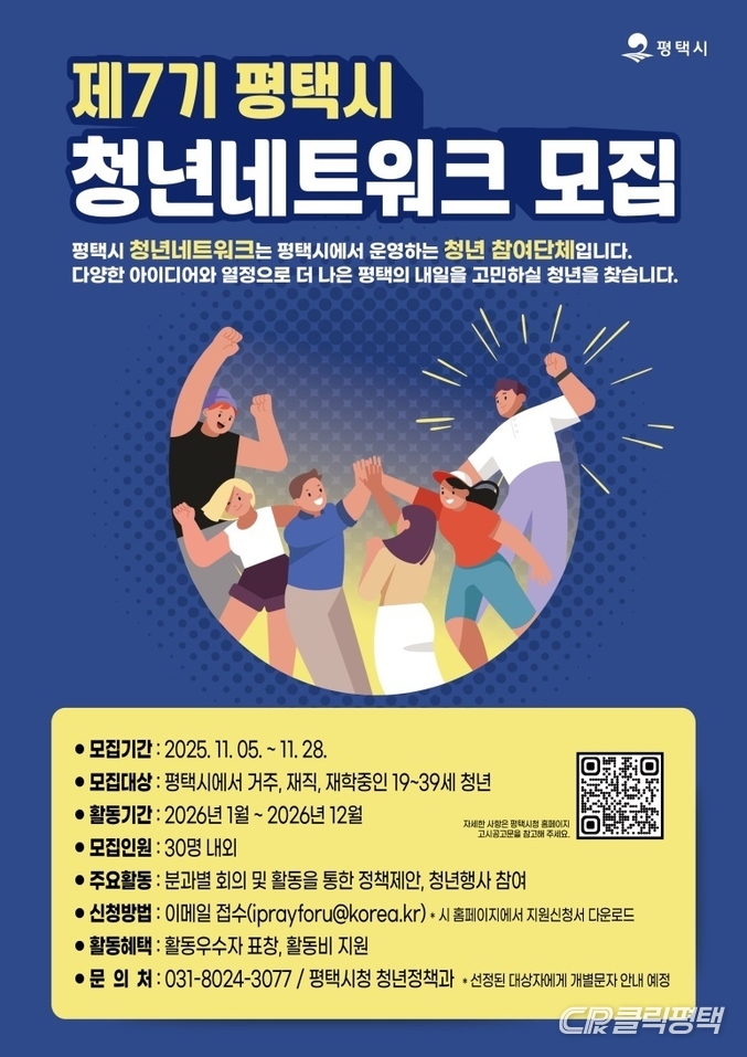 평택시(시장 정장선)가 오는 28일까지 청년의 다양한 의견 수렴과 청년정책 추진을 위해 운영하는 ‘제7기 평택시 청년네트워크’(평청넷) 회원을 공개 모집한다곱 밝혔다.