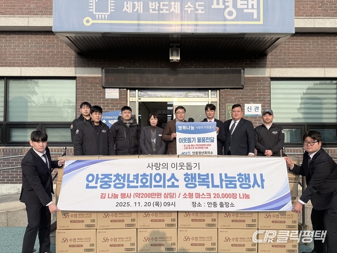 평택시 안중출장소(소장 문종호)는 20일 안중청년회의소(JCI회장 이영빈)와 ‘이웃돕기 물품 전달식’을 가졌다고 밝혔다.
