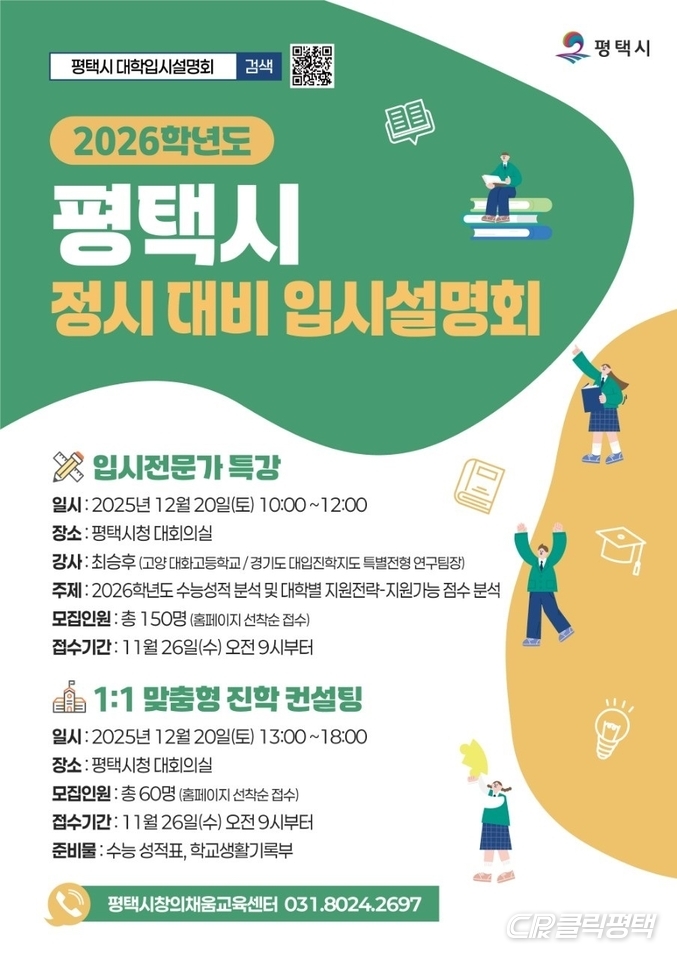 평택시(시장 정장선)는 다음 달 20일 시청 대회의실에서 ‘2026년 정시 대비 입시설명회’를 개최한다고 밝혔다.