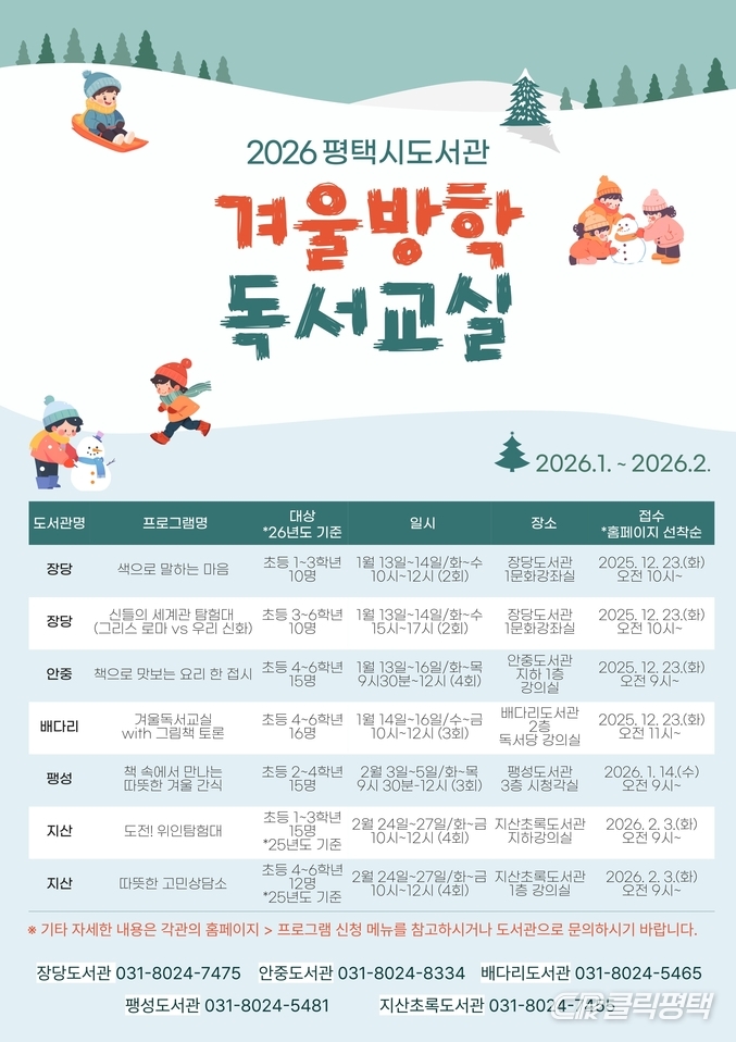 평택시 도서관은 다음 해 1월에서 2월까지 어린이들의 사고력과 창의력 향상을 돕기 위해 ‘2026 겨울방학 독서교실’을 지역 내 5개 도서관에서 운영한다고 밝혔다.