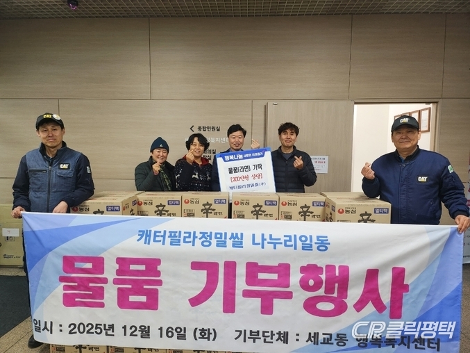 평택시 소재 ㈜캐터필라정밀씰 봉사단체인 ‘나누리’는 지난 16일 세교동 행정복지센터를 찾아 연말연시를 맞아 200만 원 상당의 라면 62박스를 기부하며 따뜻한 이웃사랑 마음을 전달했다.