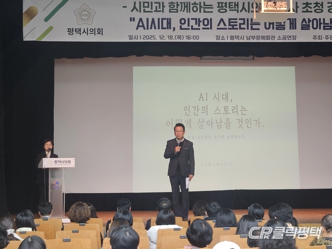 평택시의회는 지난 18일 평택시 남부문화예술회관 소공연장에서 명사를 초청해‘AI시대, 인간의 스토리는 어떻게 살아남는가’를 주제로 강연회를 열었다.