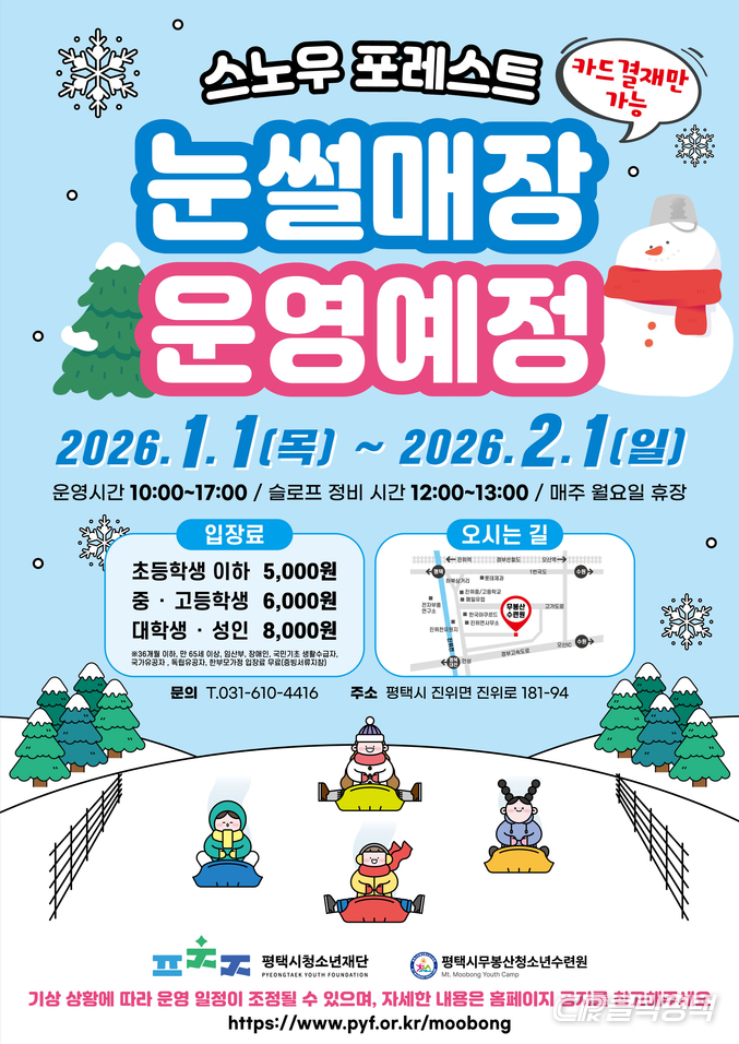 (재)평택시청소년재단(대표이사 이재남) 무봉산청소년수련원은 다음 해 1월 1일부터 2월 1일까지 눈썰매장 ‘스노우 포레스트’를 운영할 예정이라고 밝혔다.