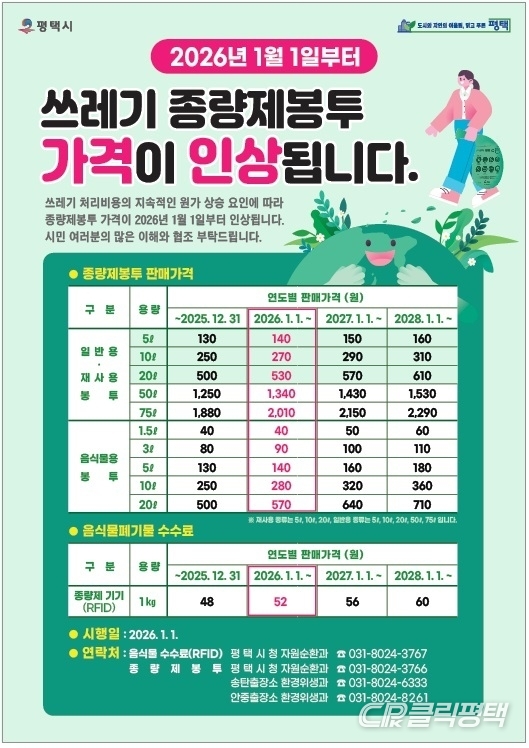 평택시(시장 정장선)는 2026년 1월 1일부터 쓰레기 종량제 봉투 가격을 3개년도에 걸쳐 인상한다고 밝혔다.