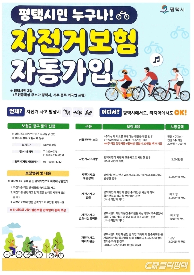 시에 따르면 평택시 자전거 보험은 평택시에 주민등록이 돼 있는 시민이라면 별도의 가입 절차 없이 자동으로 가입되며 자전거 사고로 인한 사망·후유장해, 진단위로금, 벌금, 변호사 선임 비용 등을 보장한다.