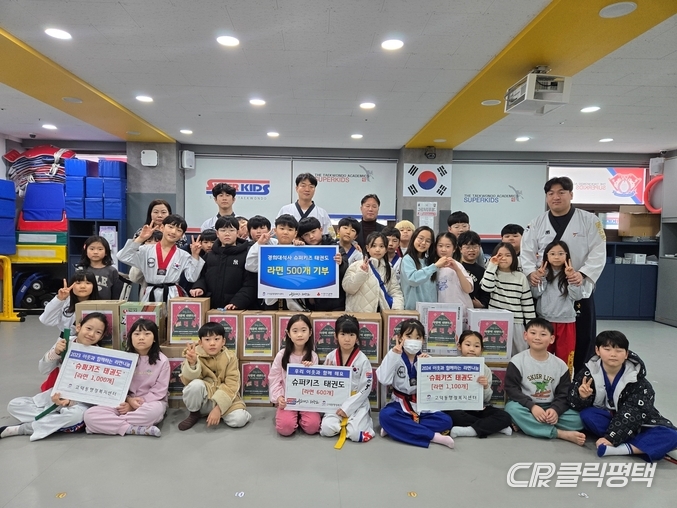 평택시 고덕동에 소재한 경희대 석사 슈퍼키즈 태권도장(관장 이상필)이 지난 19일 원생들이 직접 모은 라면 500개를 고덕동 행정복지센터에 전달했다.