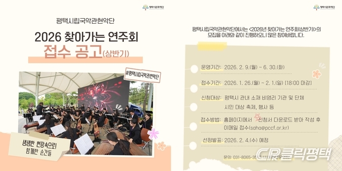 평택시문화재단(대표이사 이상균)평택시립국악관현악단이 다음 달 1일까지 시민들의 문화 향유 기회를 확대하기 위해 2026년 찾아가는 연주회 상반기 참여단체를 모집한다고 밝혔다.