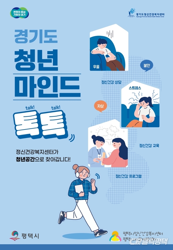 평택시(시장 정장선)는 29일 학업과 취업 등 환경적 요인으로 증가하는 청년 정신질환에 미리 개입하고 적절한 치료 서비스를 제공하고자 ‘청년마인드톡톡’ 사업을 운영한다고 밝혔다.