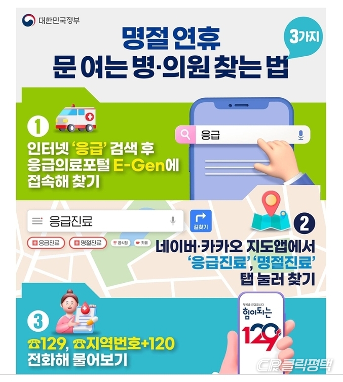 설 연휴 문 여는 의료기관과 약국 정보는 129(보건복지콜센터)와 120(시도 콜센터), 응급의료포털(www.e-gen.or.kr) 또는 평택·송탄보건소 누리집에서 확인할 수 있다.