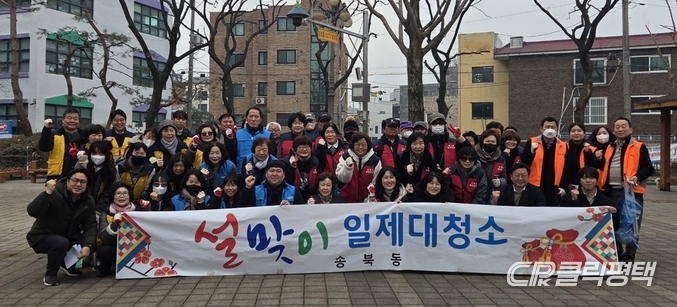평택시 송북동 행정복지센터(동장 정연숙)는 지난 11일 관계단체와 공직자 등 80여 명이 참여해 ‘설맞이 일제 대청소’를 실시했다고 밝혔다.