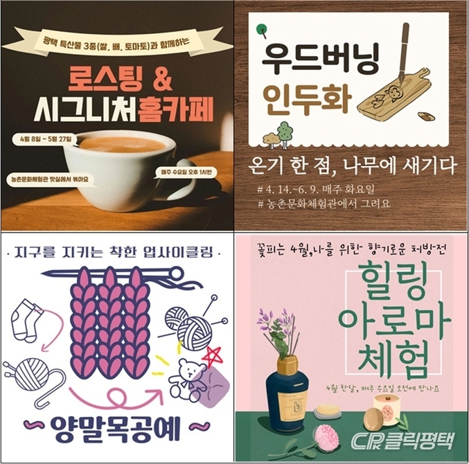주요 내용은 ▲평택 특산물을 활용한 로스팅 및 홈카페 메뉴 만들기 ▲버려지는 자원을 재활용하는 리사이클링 양말목 공예 ▲천연 아로마 에센스로 화장품을 직접 만드는 힐링 아로마 클래스 ▲나무에 온기를 담아내는 현대 우드버닝 등 자연 친화적인 취미 활동으로 꾸며진다.