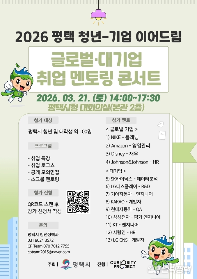 평택시(시장 정장선)는 오는 20일까지 ‘평택 청년-기업 이어드림, 글로벌·대기업 취업 멘토링 콘서트’ 참가자를 모집한다고 밝혔다.