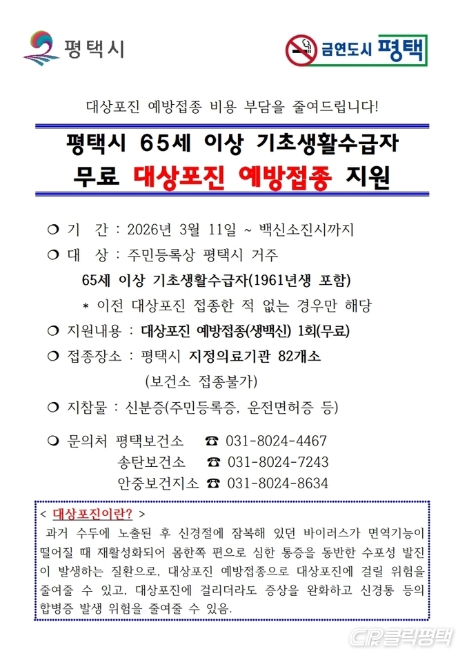 평택시(시장 정장선)는 9일 65세 이상 취약계층 노인의 건강증진과 예방접종 비용 부담 완화를 위해 ‘대상포진 예방접종을 연중 무료로 지원’한다고 밝혔다.