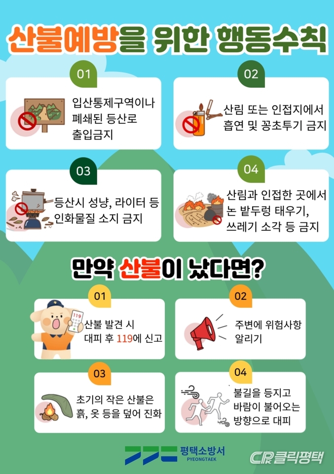 평택소방서(서장 최덕호)는 10일 건조한 날씨와 강한 바람으로 산불 발생 위험이 높아지는 봄철을 맞아 시민들에게 산불 예방 안전수칙 준수를 당부했다.