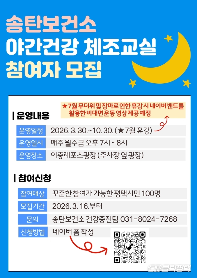 송탄보건소 관계자는 “올해 야간건강 체조교실은 시민들이 규칙적으로 운동하는 습관을 기를 수 있도록 운영하고, 무더위 휴강 기간에는 비대면 운동 프로그램도 함께 제공해 꾸준히 건강관리를 이어갈 수 있도록 준비했다”며 “앞으로도 시민 눈높이에 맞는 건강증진 프로그램을 지속적으로 추진하겠다”고 말했다.