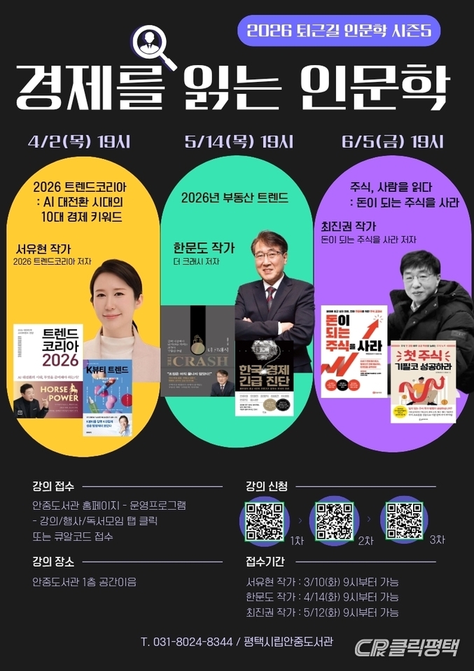 첫 번째 강연은 다음 달 2일 오후 7시, 안중도서관 1층 공간이음에서 ‘2026 트렌드코리아’ 공저자인 서유현 작가를 초청해 ‘2026 트렌드코리아: AI 대전환 시대의 10대 경제 키워드’를 주제로 강의를 진행한다.
