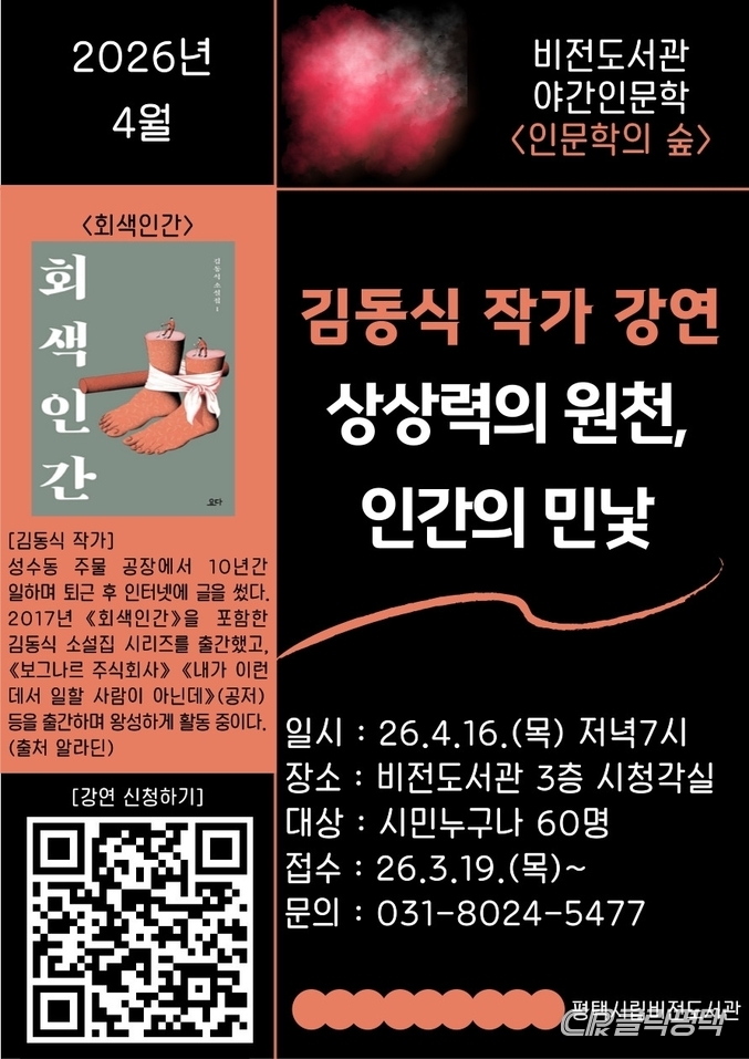 평택시 비전도서관은 다음 달 16일 김동식 작가를 초청해 ‘상상력의 원천, 인간의 민낯’을 주제로 야간 인문학 강연을 진행한다고 밝혔다.