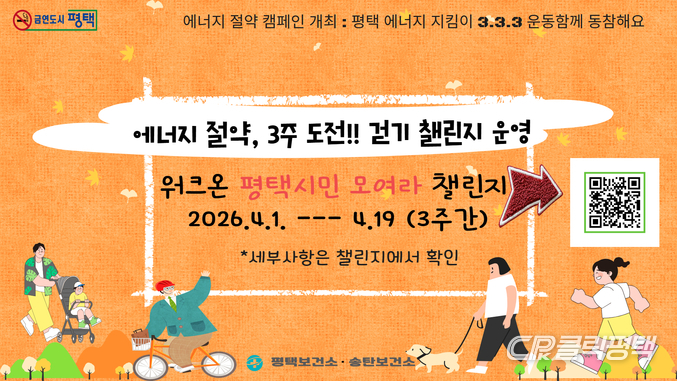 평택시(시장 정장선)는 다음 달 1일부터 19일까지 최근 중동 사태 장기화에 따른 국제 유가 상승 등 에너지 위기 상황을 극복하고, 시민 주도의 실천 문화를 확산하기 위해 ‘에너지 절약, 걷기 챌린지’를 운영한다고 밝혔다.