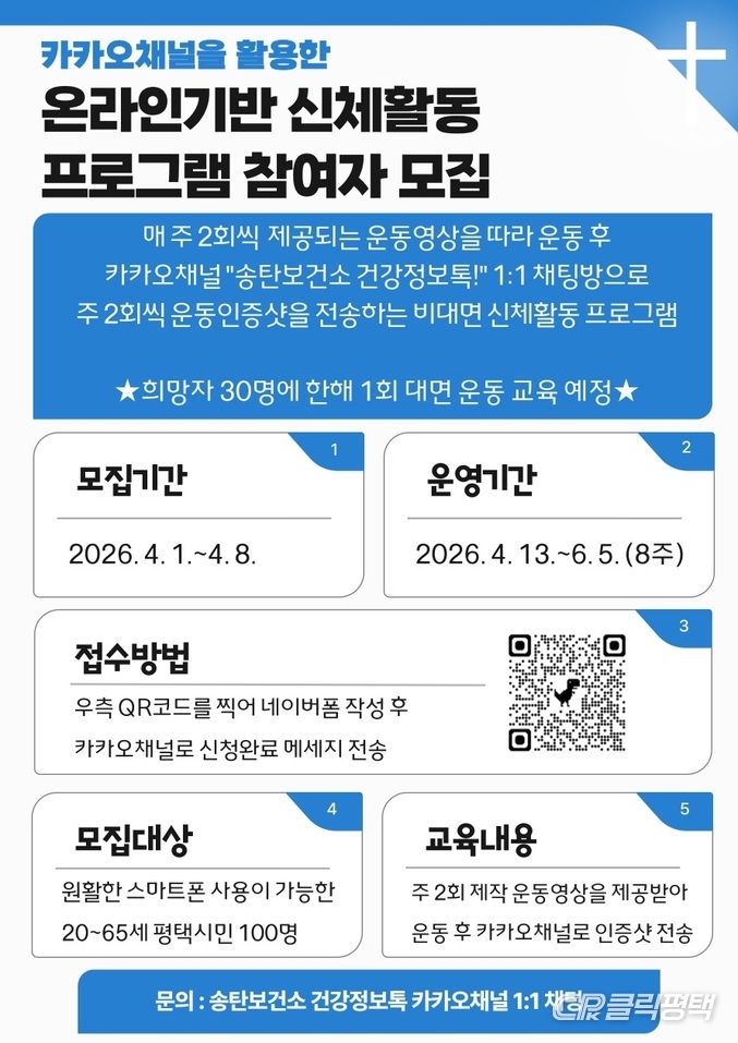 31일 시에 따르면 오는 13일부터 6월 5일까지 진행되는 이번 프로그램은 보건소 방문이 어려운 시민들도 손쉽게 참여할 수 있도록 ‘송탄보건소 카카오톡 채널’을 기반으로 운영된다.