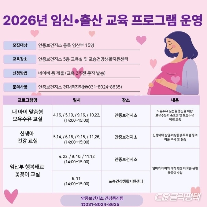 평택시(정장선) 안중보건지소는 6일 지역 내 임산부들의 건강한 출산을 돕고 체계적인 육아 정보를 제공하기 위해 ‘2026년 임신·출산 교육 프로그램’을 본격 운영한다고 밝혔다.