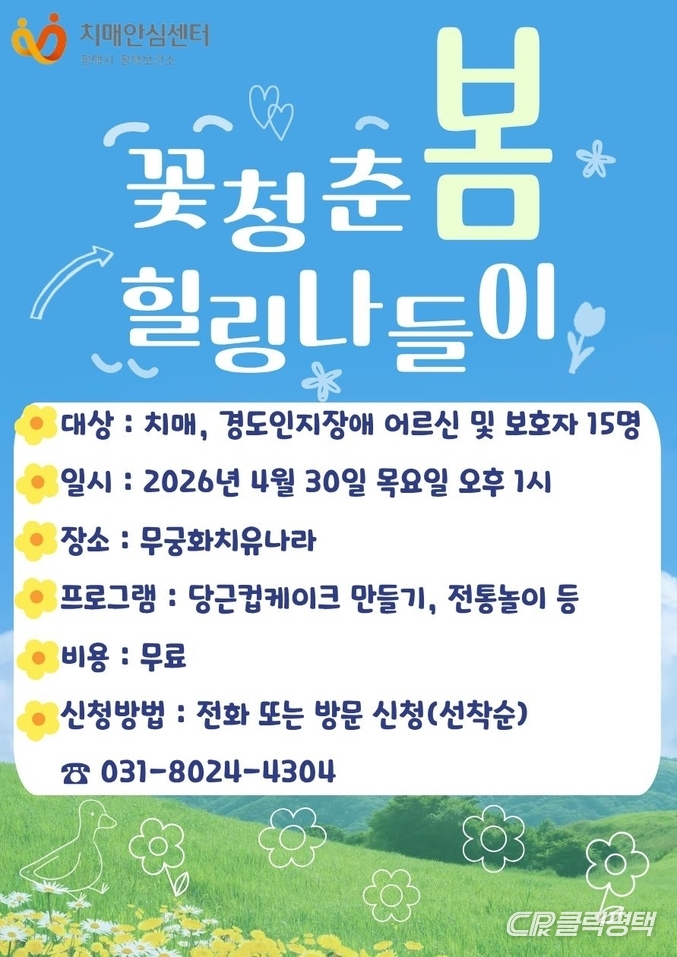 평택시(시장 정장선)는 14일 선착순으로 평택치매안심센터에 등록된 치매 환자 가족과 보호자의 돌봄 스트레스를 해소하고 심리적 안정을 돕기 위한 힐링 프로그램 ‘꽃청춘 힐링 나들이’의 참여자를 모집한다고 밝혔다.