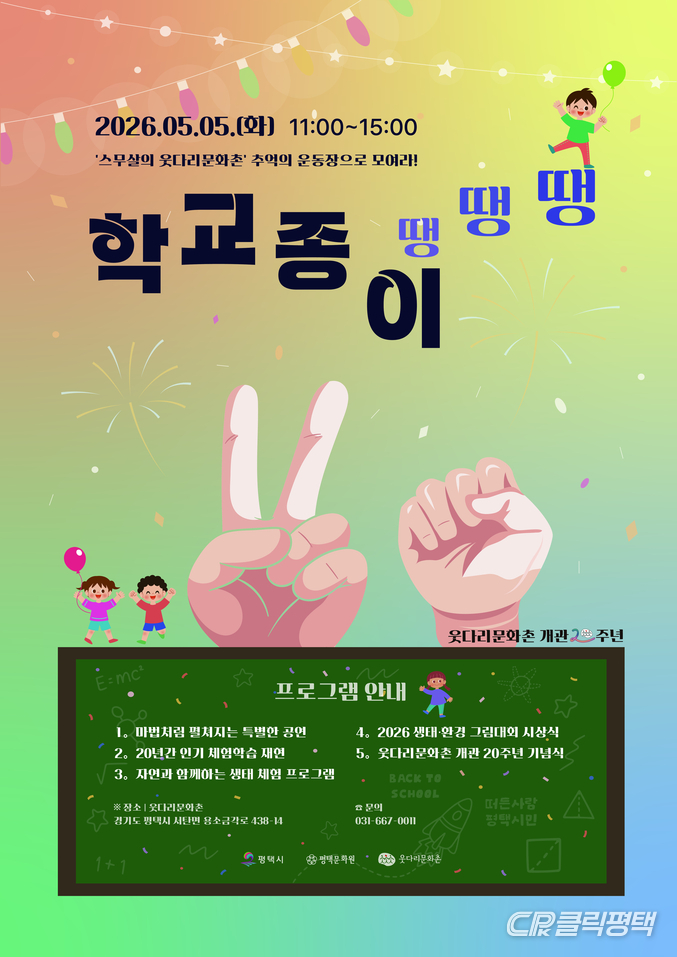오중근 원장은 “이번 20주년 기념 행사는 웃다리문화촌이 걸어온 시간을 시민과 함께 나누고, 앞으로의 방향을 함께 그려가는 자리”라며 “어린이와 가족 모두가 즐겁고 의미 있는 시간을 보내길 바란다”고 전했다.