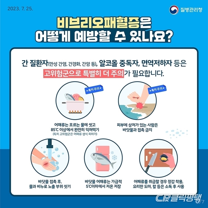 특히 만성 간 질환자, 당뇨병, 알코올의존자, 면역결핍 환자, 악성종양 등 비브리오패혈증 고위험군은 감염 시 치명률이 높으므로 더욱 철저한 주의가 필요하다.