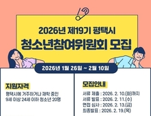 클릭평택 김용석 기자 / 평택시와 평택시청소년재단은 다음 달 10일까지 청소년 정책 참여 기회를 확대하고 자치 역량을 강화하기 위한 2026년 제19기 청소년참여위원회 위원 20명을 공개 모집한다고 밝혔다. 28일 시와 재단에 따르면 청소년참여위원회는 ‘청소년기본법’과 ‘평택시 청소년참여위원회 운영 조례’에 근거해 운영되는 청소년 참여기구로 청소년들이 직접 지역사회 정책을 논의하고 제안하는 역할을 한다. 이번에 모집하는 제19기 위원회 활동 기간은 오는 3월부터 다음 해 2월까지 1년간이며 평택시에 거주하거나 평택시 소재 학교에 재학 중인 9세 이상 24세 이하 청소년이라면 누구나 지원할 수 있다. 선발된 위원들은 ▲청소년 정책 포럼 및 토론회 개최 ▲청소년 권리·인권 모니터링 ▲청소년 정책과제 발굴 및 제안 ▲온오프라인 정책 창구 운영 ▲경기도 내 청소년참여위원회 교류 활동 등 다양한 정책 참여 활동에 참여하게 된다. 특히 위원들에게는 평택시장 명의의 위촉장 수여, 정기회의 참석 시 수당 지급, 활동 내용 생활기록부 기재, 청소년 정책제안대회 및 각종 대회 참여 기회 제공 등 실질적인 활동 혜택이 주어진다. 지원자는 평택시청소년재단 누리집 공지 사항에서 지