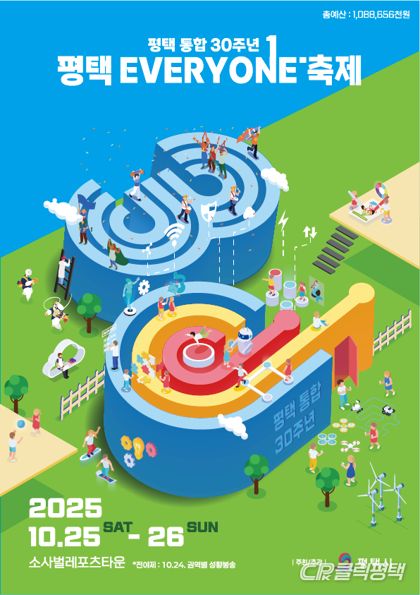 평택시(시장 정장선)는 평택시 통합 30주년을 기념해 오는 25일부터 26일까지 양일간 소사벌레포츠타운 일원에서 ‘평택 통합 30주년, 평택 EVERYONE 축제’를 개최한다고 밝혔다.