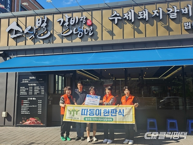 ![평택시 동삭동(동장 권봉미) 지역사회보장협의체는 지난 15일 음식 체인점인 ‘소사벌’ 법원직영점(대표 이승표)에 ‘따동이’ 5호점 현판 전달식을 가졌다고 밝혔다.[사진=평택시]](http://www.xn--py2bn03bbjav3h.org/data/photos/20251042/art_17606039047445_7326f7.jpg?iqs=0.3980008195278819)