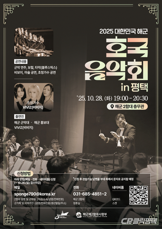 해군 제2함대사령부는 오는 28일 오후 7시 부대 내 충무관에서 ‘2025 대한민국해군 평택 호국음악회’를 개최한다고 밝혔다.