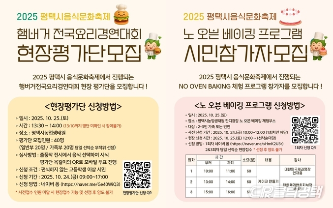 22일 시에 따르면 축제에서는 ▲전국 요리경연대회 ▲평택 지역 맛집 및 세계음식 시식·체험관 ▲노 오븐 베이킹 체험관 ▲탄소중립 실천·홍보관 등 다채로운 부스가 운영돼 시민들에게 풍성한 경험을 선사할 예정이다.