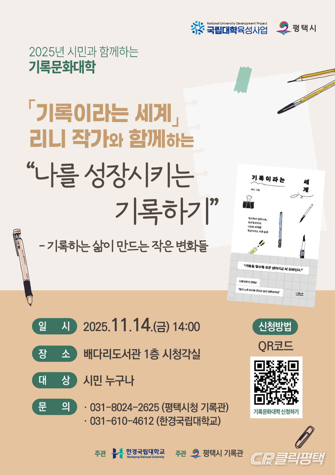 한경국립대학교는 평택시 기록관과 함께 오는 14일 평택시 배다리도서관에서 ‘2025 시민과 함께하는 기록문화대학’을 개최한다고 밝혔다.