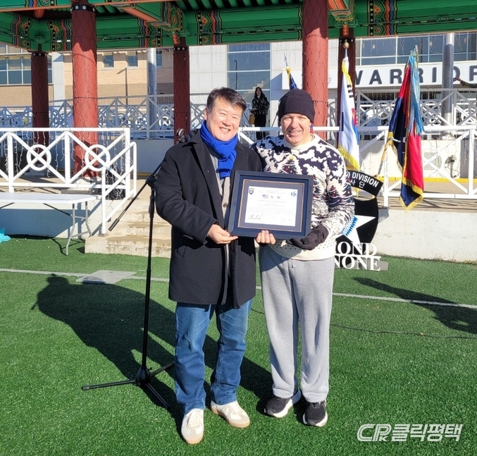 사단법인 한미어린이 문화교류협회 김수우 이사장이 5일 평택 캠프 험프리스에서 열린 주한 미 2사단 크리스마스 점등식 행사에 초청받아 미 2사단 찰스 롬바르도(Charles Lombardo) 사단장으로부터 고마움을 전하는 감사장을 받았다.