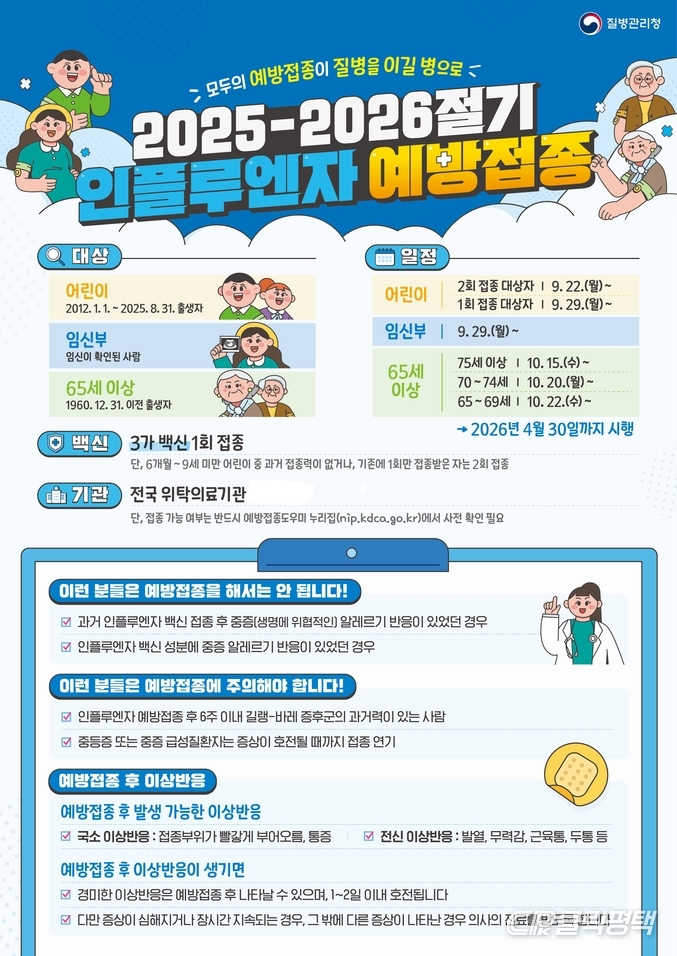 평택시(시장 정장선) 송탄보건소(소장 조민수) 21일 호흡기 감염병 예방수칙 준수를 당부하고 예방접종을 받지 않은 고위험군은 지금이라도 접종을 받을 것을 권고했다.