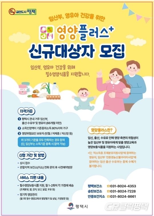 평택시 평택보건소는 20일 영양 위험 요인이 있는 임산부와 영유아의 건강증진을 위한 ‘2026년 영양플러스 사업’ 대상자를 모집한다고 밝혔다.