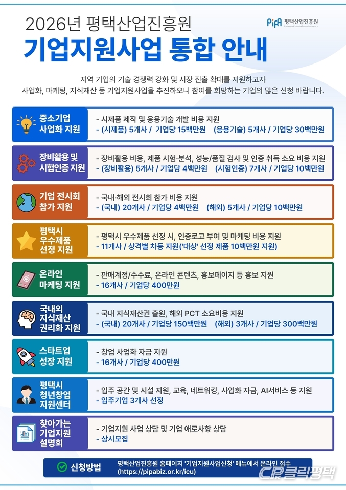 각 지원사업의 모집 공고는 평택산업진흥원 누리집 내 ‘기업지원사업 신청’ 메뉴에서 확인할 수 있으며 사업별 세부 지원 내용과 신청 방법은 해당 공고문을 통해 안내될 예정이다.