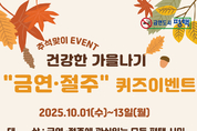 클릭평택 김용석 기자 / 평택시 송탄보건소(소장 조민수)에서 오는 1일부터 13일까지 시민 누구나 참여할 수 있는 ‘건강한 가을나기 금연·절주 퀴즈 이벤트’를 진행한다. 30일 보건소에 따르면 이번 퀴즈 이벤트는 정보무늬(QR코드)를 활용 간편하게 참여할 수 있으며 금연·절주의 필요성과 건강관리 정보를 흥미로운 퀴즈 형식으로 접할 수 있도록 기획됐다. 퀴즈를 완료한 참여자 중 정답자 100명을 추첨해 금연 홍보물(보조배터리)을 증정하며 당첨자는 오는 15일 개별 문자로 안내된다. 상품은 오는 16일부터 22일까지 송탄보건소 1층 헬스케어상담센터 내 금연클리닉에서 수령할 수 있다. 송탄보건소 관계자는 “모든 시민이 금연과 절주의 필요성을 이해하고 건강한 생활을 실천하는 계기가 되길 바란다”고 전했다.