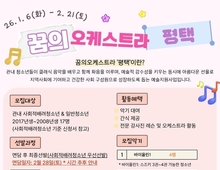 클릭평택 이석구 기자 / (재)평택시청소년재단(대표이사 이재남) 평택시청소년문화센터(센터장 곽지숙)는 다음 달 21일까지 ‘꿈의 오케스트라 평택’ 2026년 신규단원을 모집한다고 밝혔다. 12일 센터에 따르면 신규 단원 모집은 지역 내 청소년을 대상으로 클래식 음악 교육을 통해 예술적 감수성과 협동심을 기르는 과정이다. ‘꿈의 오케스트라 평택’은 청소년들이 악기 연주와 오케스트라 합주 활동을 통해 음악적 역량을 함양하고 상호 협력과 소통의 경험을 통해 건강한 사회 구성원으로 성장할 수 있도록 지원하는 예술교육 지원사업이다. 이번 모집은 2017년생부터 2008년생까지의 지역 내 사회적배려청소년 및 일반청소년을 대상으로 총 17명을 선발할 예정이며 악기별 모집 인원과 연주 수준에 따라 바이올린, 비올라, 첼로, 플루트, 트럼펫, 타악기 분야를 지원할 수 있다. 선발된 단원들은 오는 3월부터 11월까지 활동하게 되며 주 2회 파트별 연습 및 합주(화·목 오후 6시부터 8시까지)를 비롯해 꿈의향연 연주회, 다른 지역 꿈의 오케스트라와의 교류캠프, 정기연주회 등 다양한 공연 및 교류 프로그램에 참여하게 된다. 신청은 평택시청소년문화센터 공지사항을 참고, 정보무늬(Q